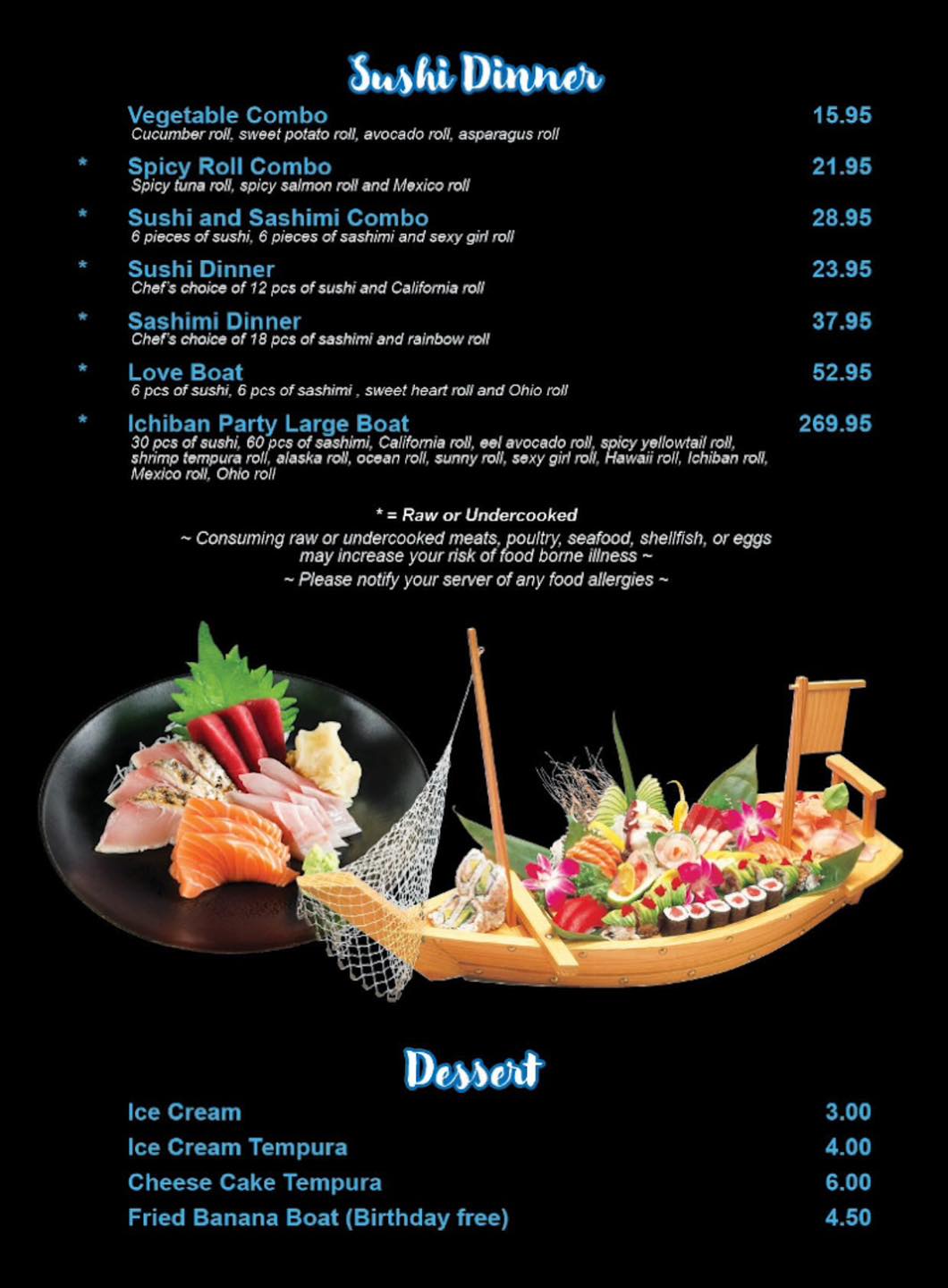 Sushi Lovers Rejoice! Ichiban offers a wide variety of sushi rolls and dinners. Some favorites include the California roll, yellowtail roll, shrimp tempura roll, volcano roll, Ohio roll, and Big Boy roll. Chef’s Special Rolls include highlights like the Ocean Roll, Spider Roll, Hawaii Roll, Fuji Roll, and many more.